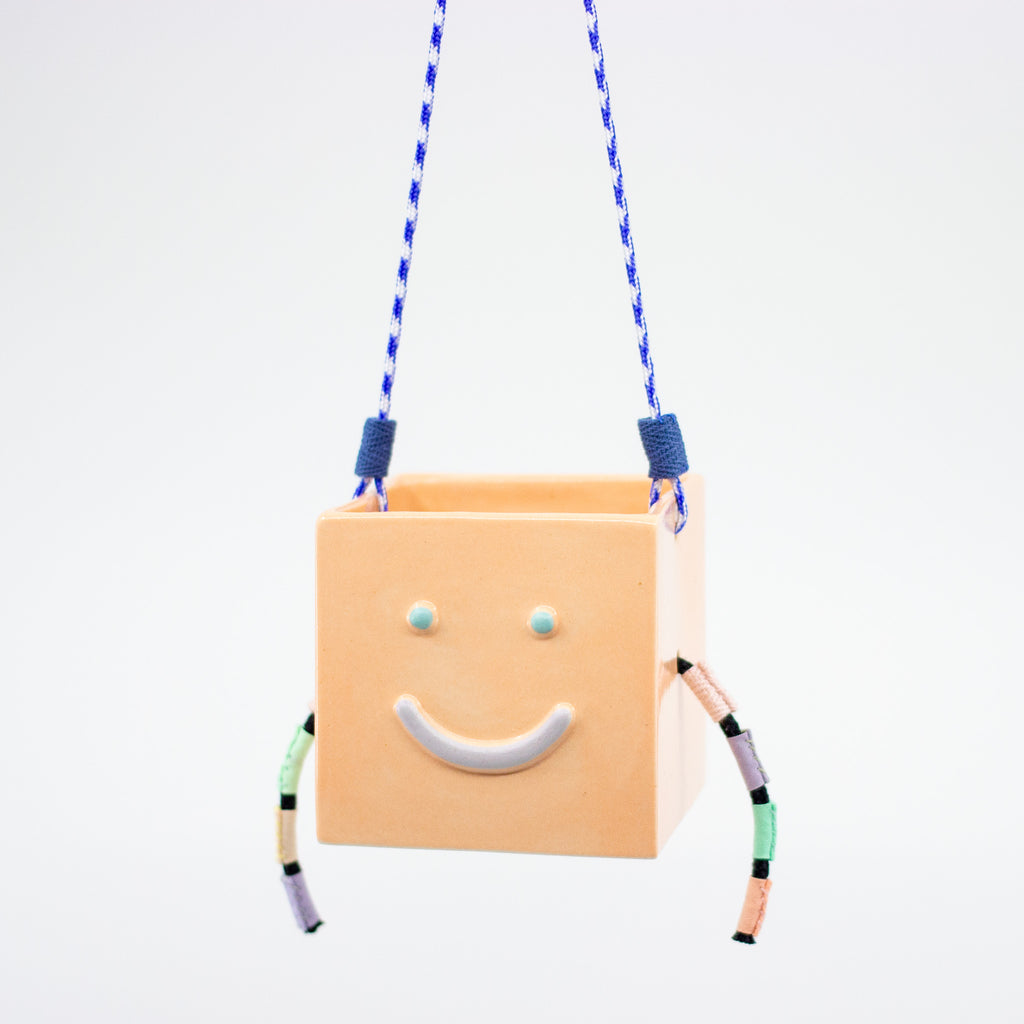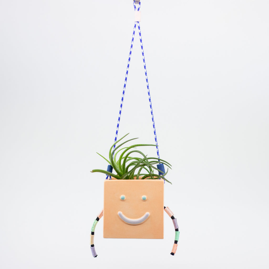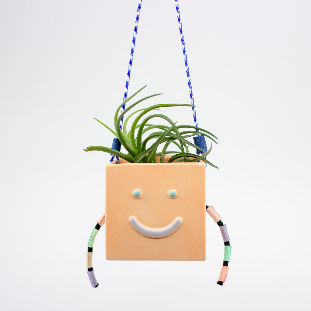 Anja is quite unique with their square body and pink glaze, hand painted highlights and hand stitched arms! Anja is content and having fun guarding your air plant. With a pastel colour and happy smile, Anja loves to just hang out. Anja is entirely handmade, hand painted, and crafted by shuh. Anja’s hanging chord and arms are also hand stitched by shuh.