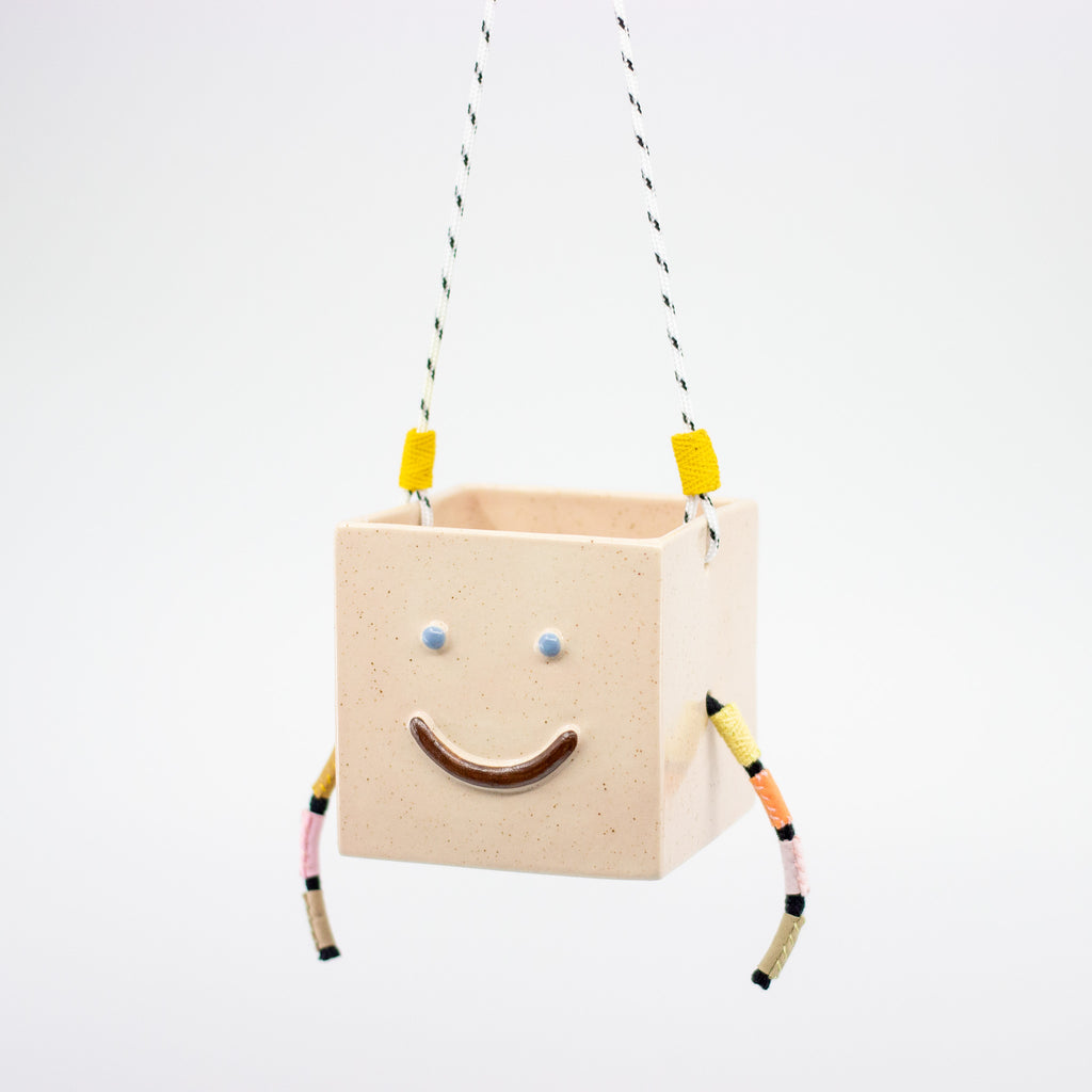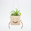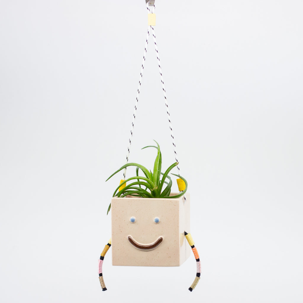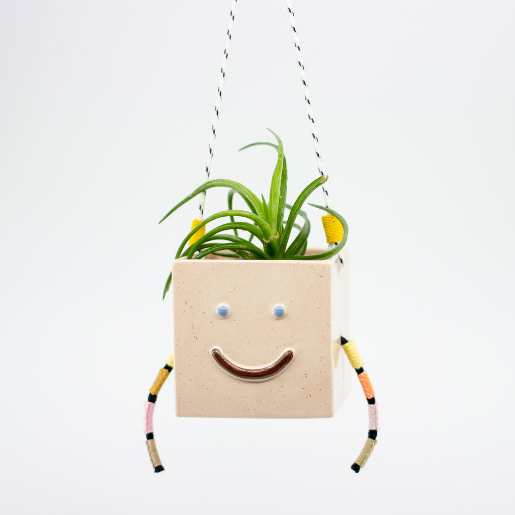 Koto is quite unique with their square body and pink glaze, hand painted highlights and hand stitched arms! Koto is content and having fun guarding your air plant. With a pastel colour and happy smile, Koto loves to just hang out. Koto is entirely handmade, hand painted, and crafted by shuh. Koto’s hanging chord and arms are also hand stitched by shuh.