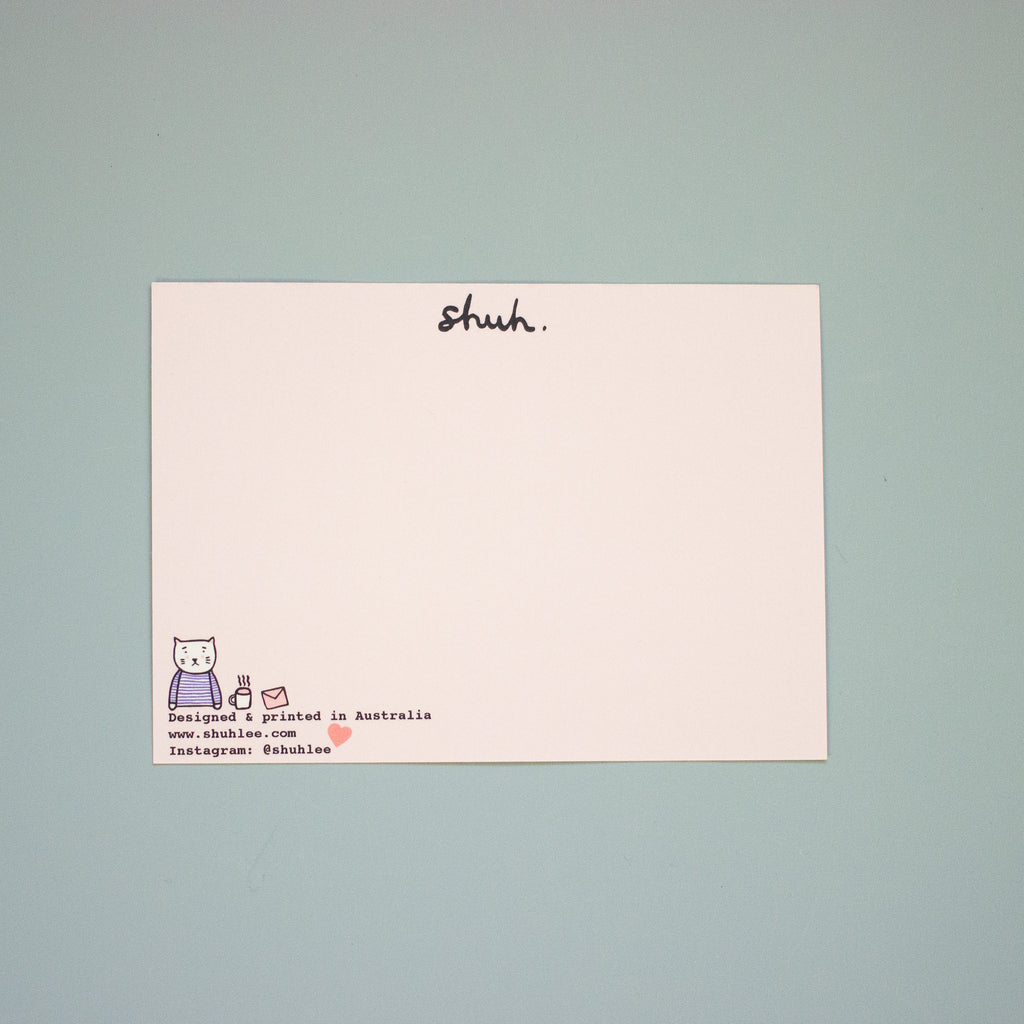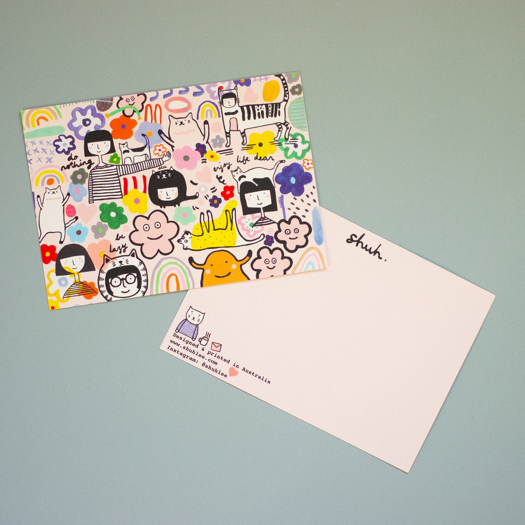 The Everything Postcard is a joyful mash-up of shuh.'s most-loved illustrations – from cheeky cats and colourful florals to playful people and rainbow doodles. A greatest-hits collection of sorts, this A6 print is a mini celebration of the shapes, faces and characters that have brightened walls, shelves, and hearts over the years.
