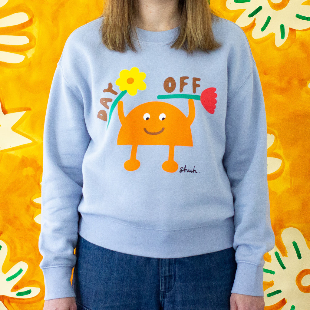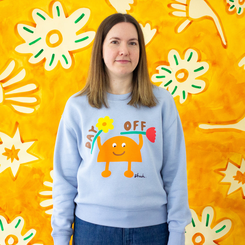 The Day Off Sweater is your cosy reminder to slow down and soak up the good stuff. Featuring shuh.’s original orange monster character holding cheerful blooms, this relaxed jumper is made for days off, chill mornings, and creative afternoons.