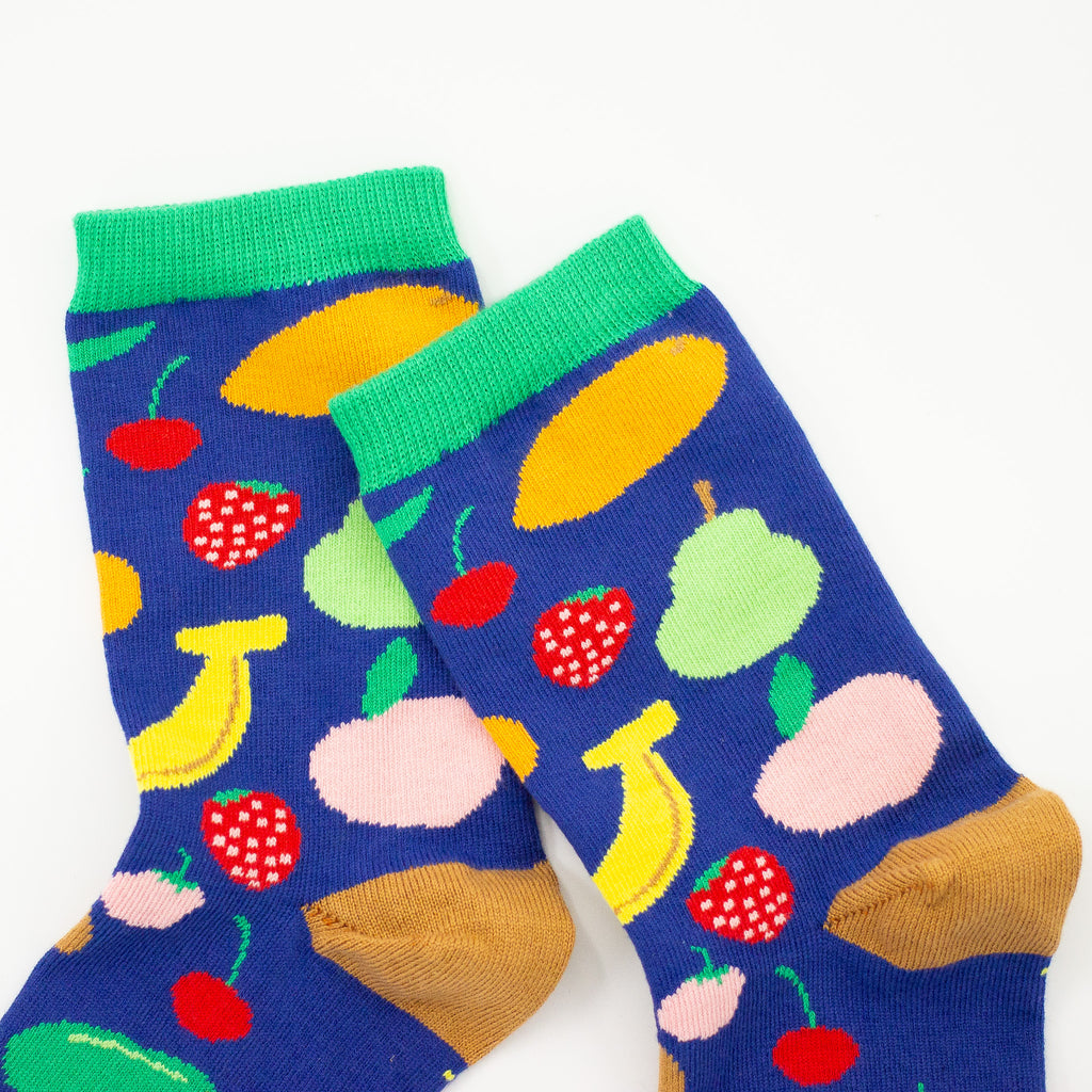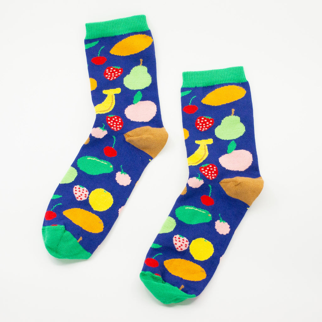 Introducing the new small batch Australian made socks by shuh. Bring the fruit shopping to your feet with our bold and sweet Shupermarket Socks! Bursting with colourful pears, bananas, cherries, apples, and avocados on a bright blue background, these fun socks are made in Australia and designed to keep your toes toasty and your outfit full of flavour. Whether you're lounging at home or heading out to brighten someone's day, these socks are the perfect pop of colour. Add a little Shupermarket energy to your step!